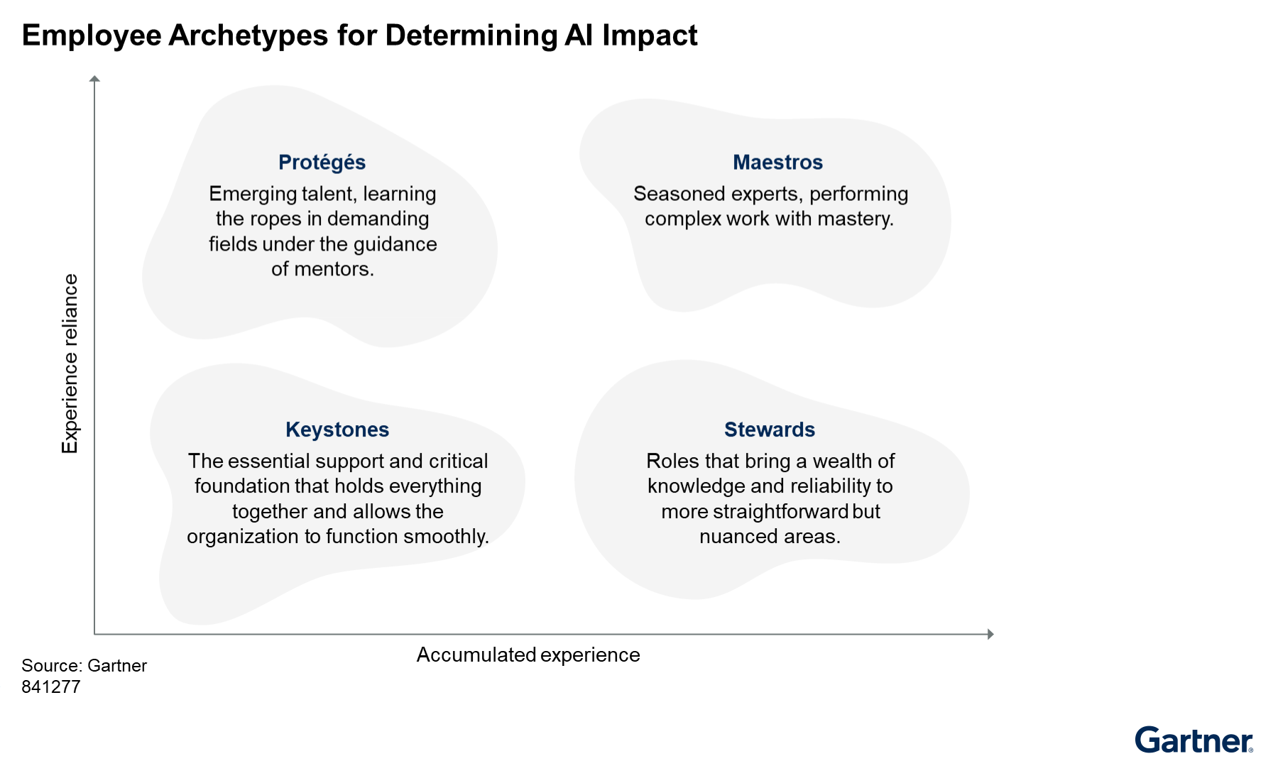 To help determine the impact of AI on employees, CHROs can use the following framework created by Gartner that splits employees into four archetypes, based on the combination of their accumulated experience and experience reliance.