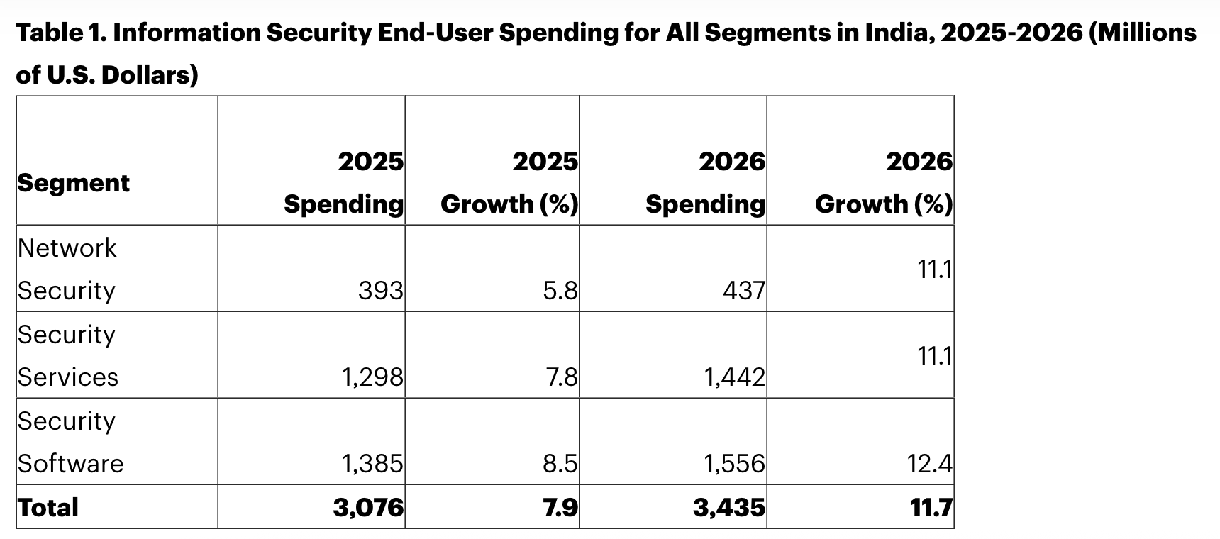 Security services spending in India is projected to achieve 11.1% growth in 2026, driven by demand for managed security services, the fastest growing subsegment with an estimated 15.1% growth rate.