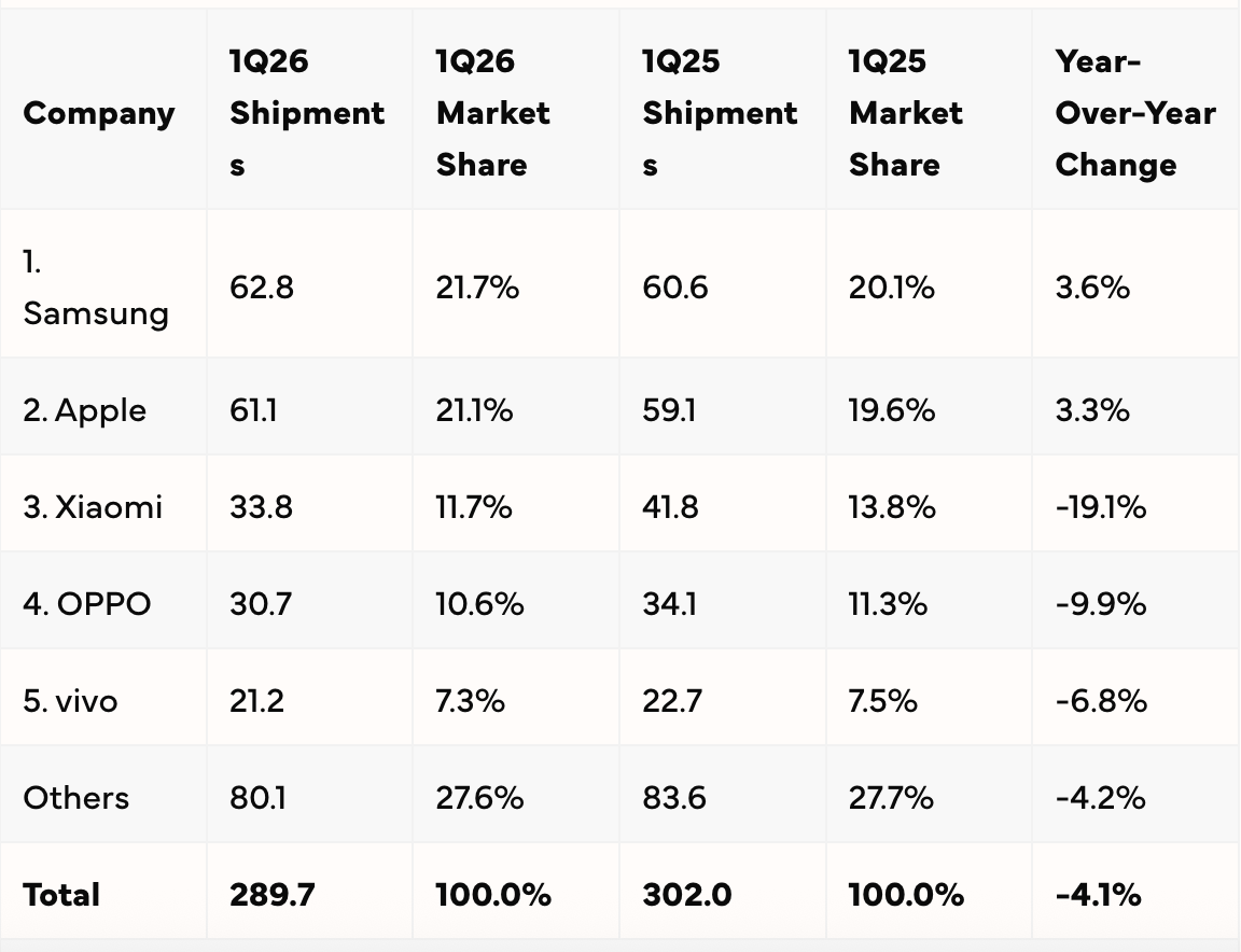 Samsung and Apple Grew in Q1 2026 as Global Smartphone Shipments Decline 4.1% amid memory constraints – IDC – April 29, 2026.