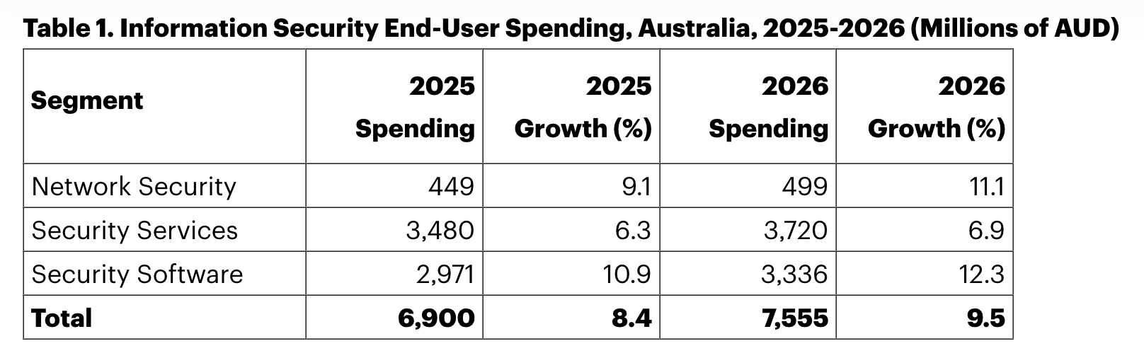 Gartner forecasts a 12.3% increase on security software spending in Australia to more than AU$3.3 billion in 2026 (see Table 1). The rapid adoption of AI is triggering a spike in the cybersecurity resources required to secure it, with increased investments in security software markets like application security, data security and privacy, and infrastructure protection.